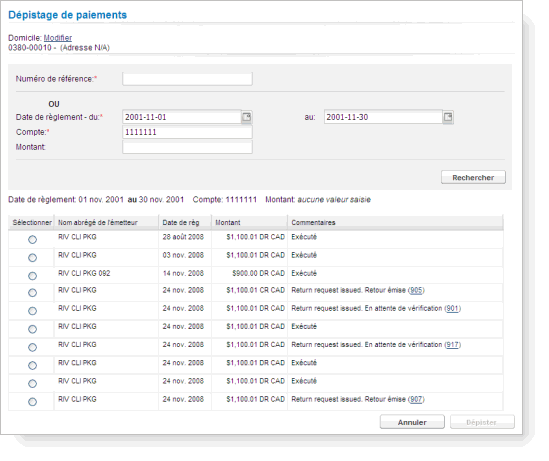 Cette page ne s'affiche que si vous avez le droit de dépister des paiements associés à ce numéro de domiciliation.